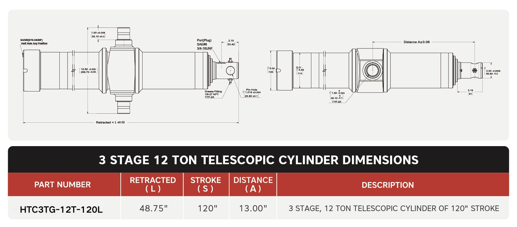 "HTC3TG-12T-120L", 3 étages, 12 tonnes de vérins télescopiques à course de 120 pouces et à distance de tourillon de 13 pouces