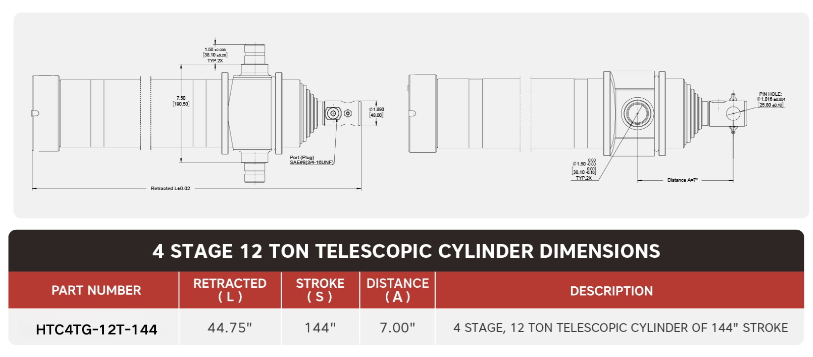 Balises actives: "HTC4TG-12T-144", 4 étages, 12 tonnes de cylindre télescopique à course de 144", fabricants, fournisseurs, vente en gros, sur mesure, en stock, camion refusé, Chine, chasse-neige