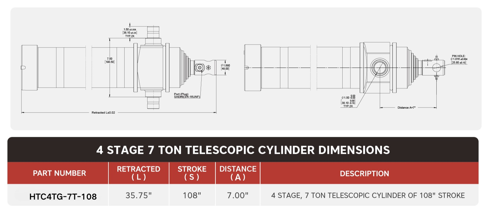 Balises actives: "HTC4TG-7T-108", 4 étages, 7 tonnes de cylindre télescopique à course de 108", fabricants, fournisseurs, vente en gros, sur mesure, en stock, camion refusé, Chine, chasse-neige